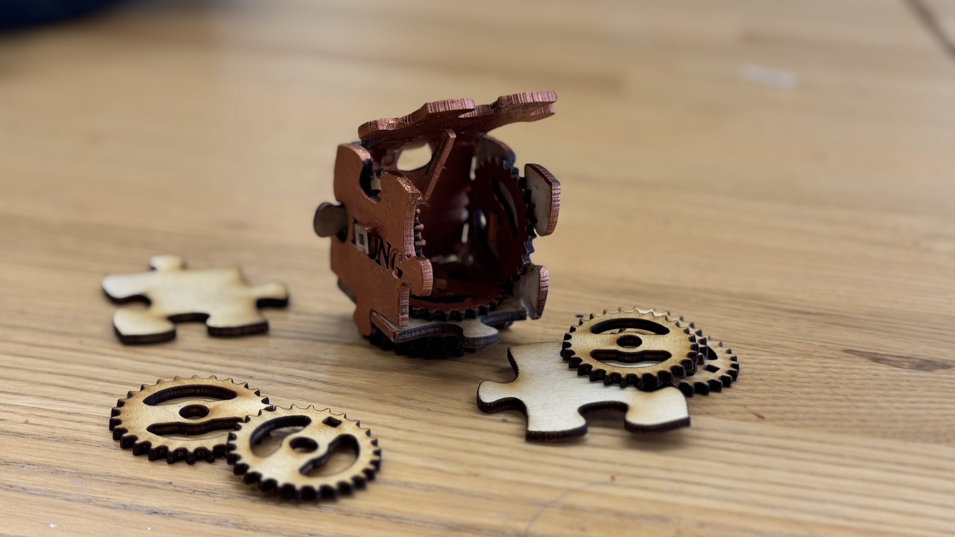 To fix this, I re-cut the final piece and created a new base with additional gears to include an engraved element. As I did not want to attach the engraved piece to the cube, it needed some kind of base to stand it. Additionally, I decided to use remaining gears to decorate the base. So I came up with this design.