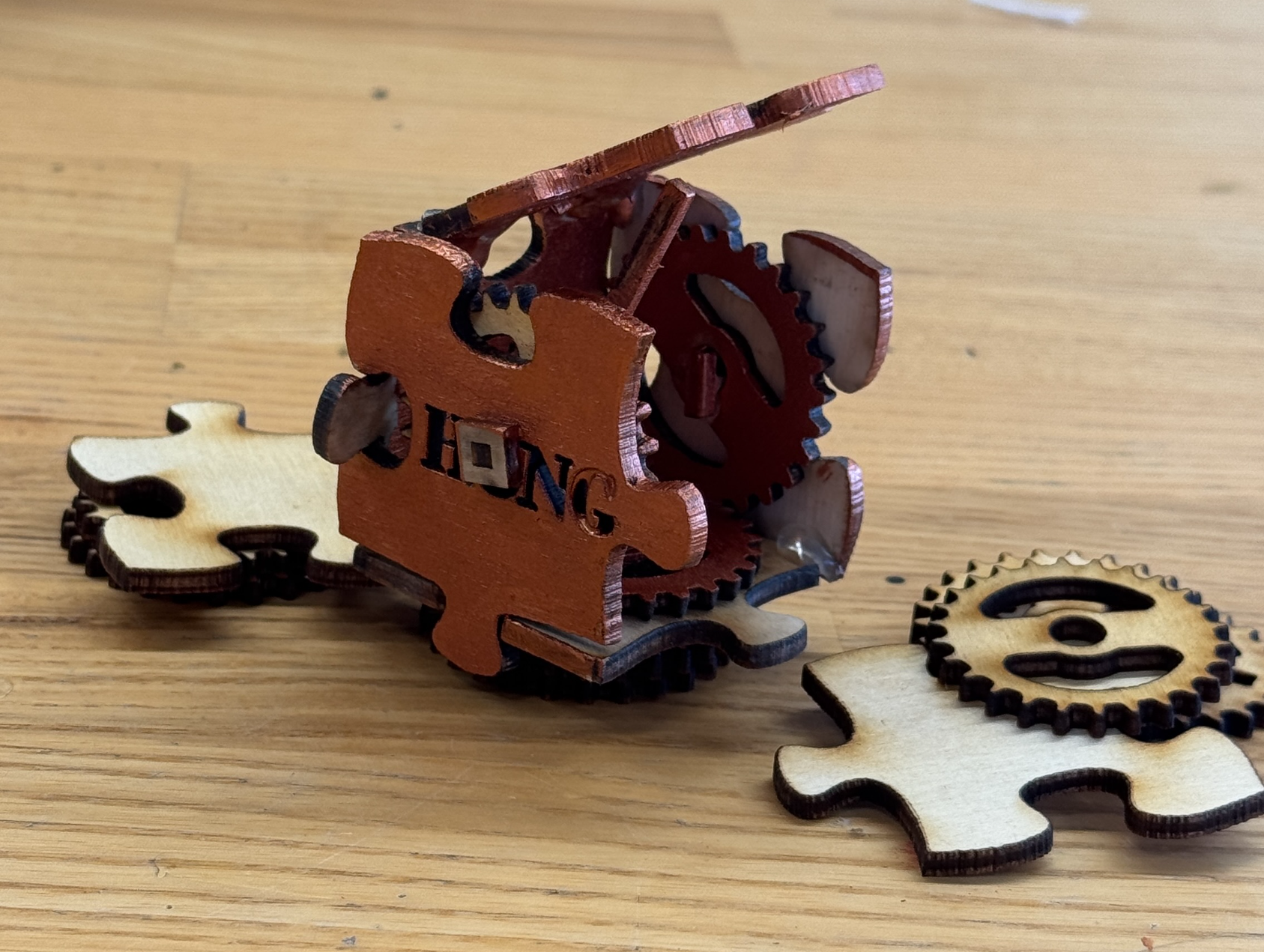 1) The gears should be smaller. Since the edges of each side were curved, they overlapped slightly. Therefore, the gears needed to be a bit smaller. But they should not be too small because they still need to engage properly (left photo).