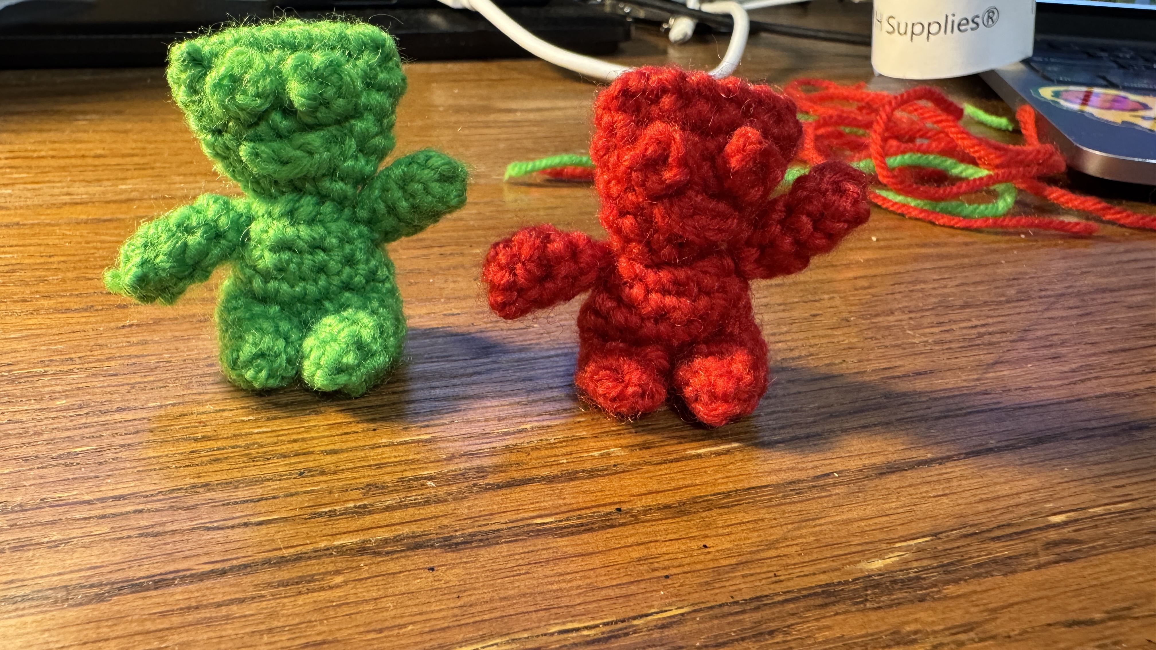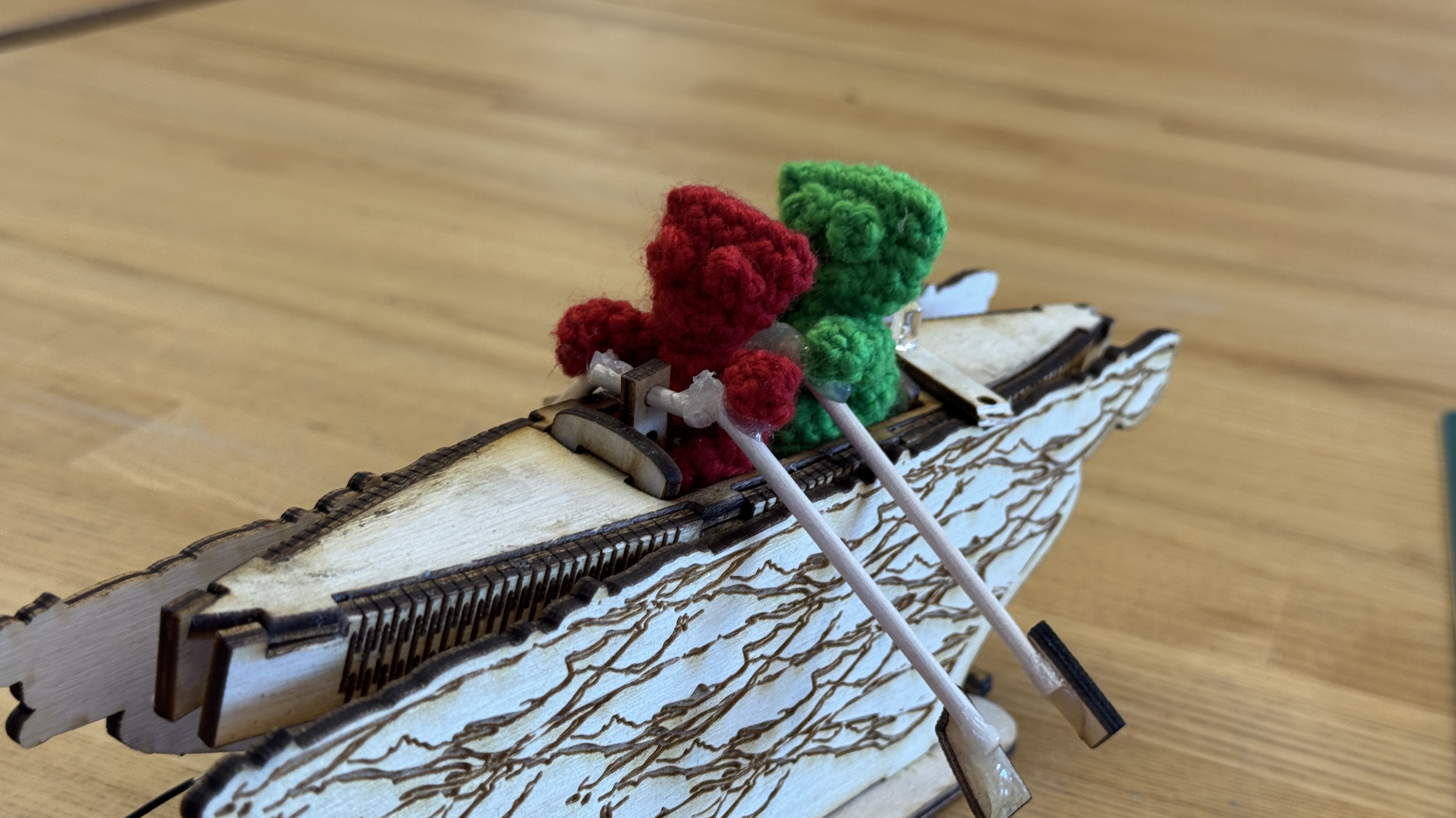 Each one took about an hour to make. With my prior experience, I started by crocheting the head first. Then, I made two legs separately and connected them, building upwards to form the body. I also wanted the arms to be able to rotate so they could “row” the boat, so I attached the arms last.