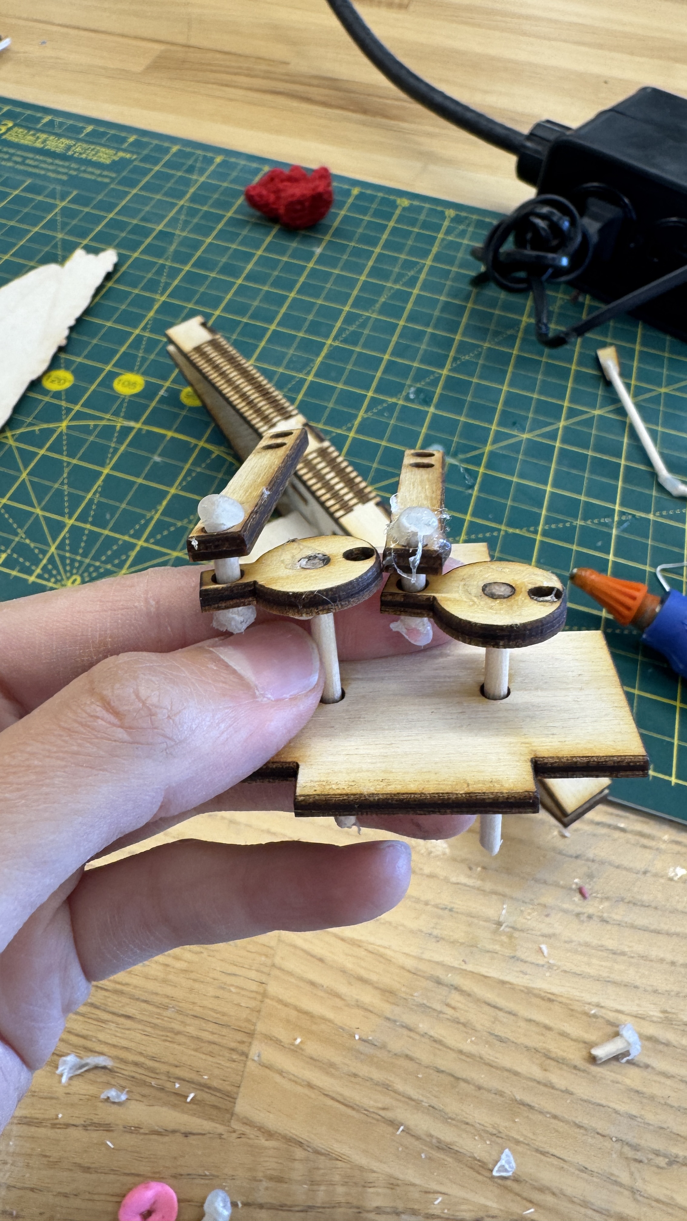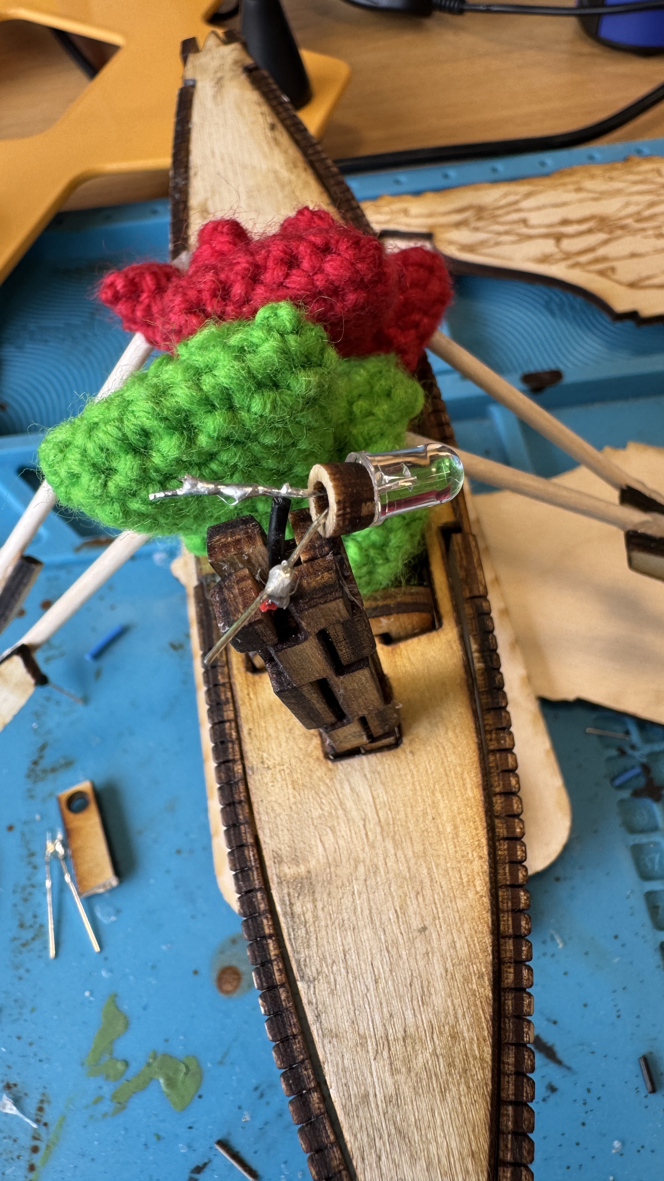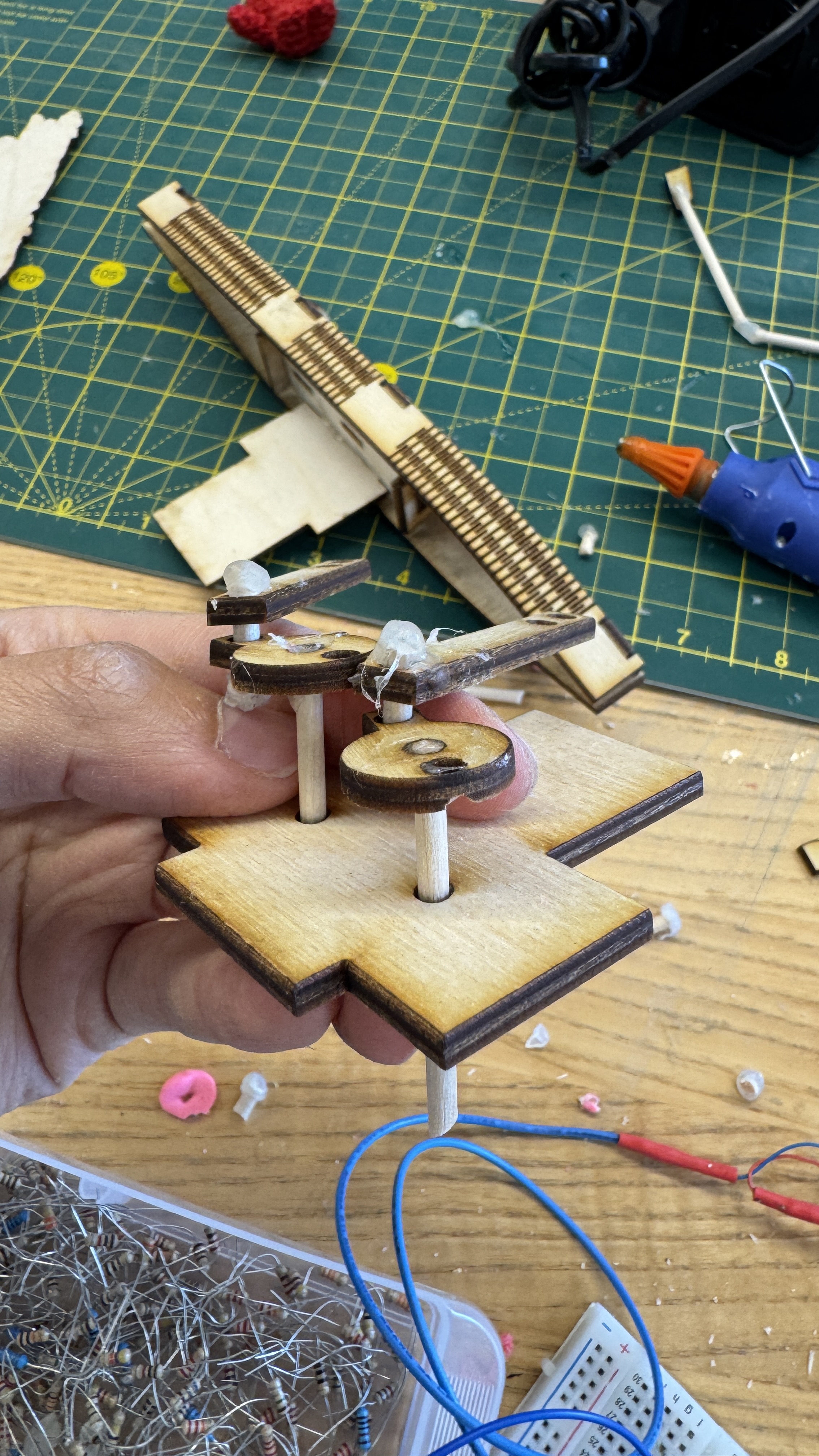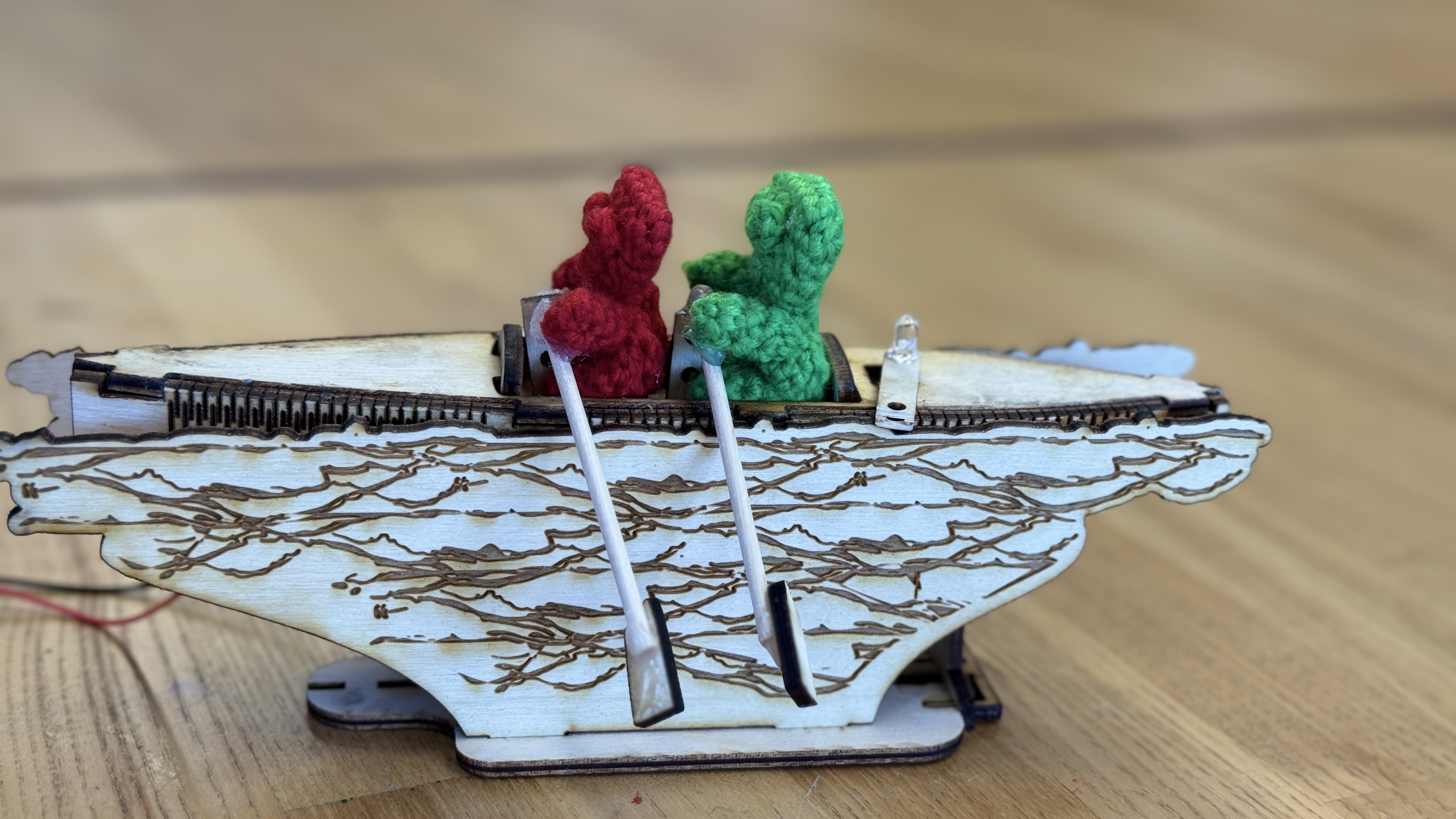 I referenced this document- https://learn.birdbraintechnologies.com/hummingbirdduo/projects/laser-cut-mechanisms/laser-cut-mechanisms-cranks/ - but producing a mechanism small enough proved difficult. The holes on the bottom of the boat needed to be longer for the bars to move freely, and the space between the boat stands needed to be wider and arranged in an “A” shape. Due to these constraints, I decided to connect the circuit to the lights only.
