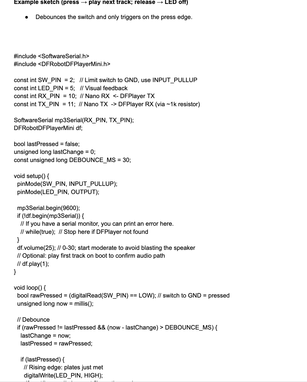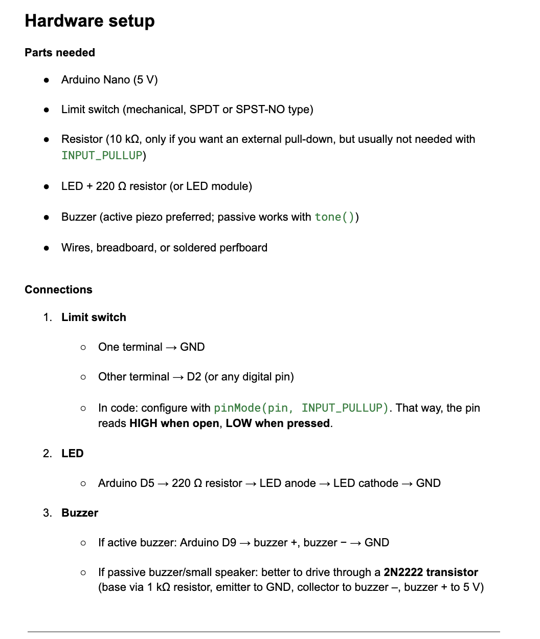 Hardware setup Parts needed Arduino Nano (5 V) Limit switch (mechanical, SPDT or SPST-NO type) Resistor (10 kΩ, only if you want an external pull-down, but usually not needed with INPUT_PULLUP) LED + 220 Ω resistor (or LED module) Buzzer (active piez