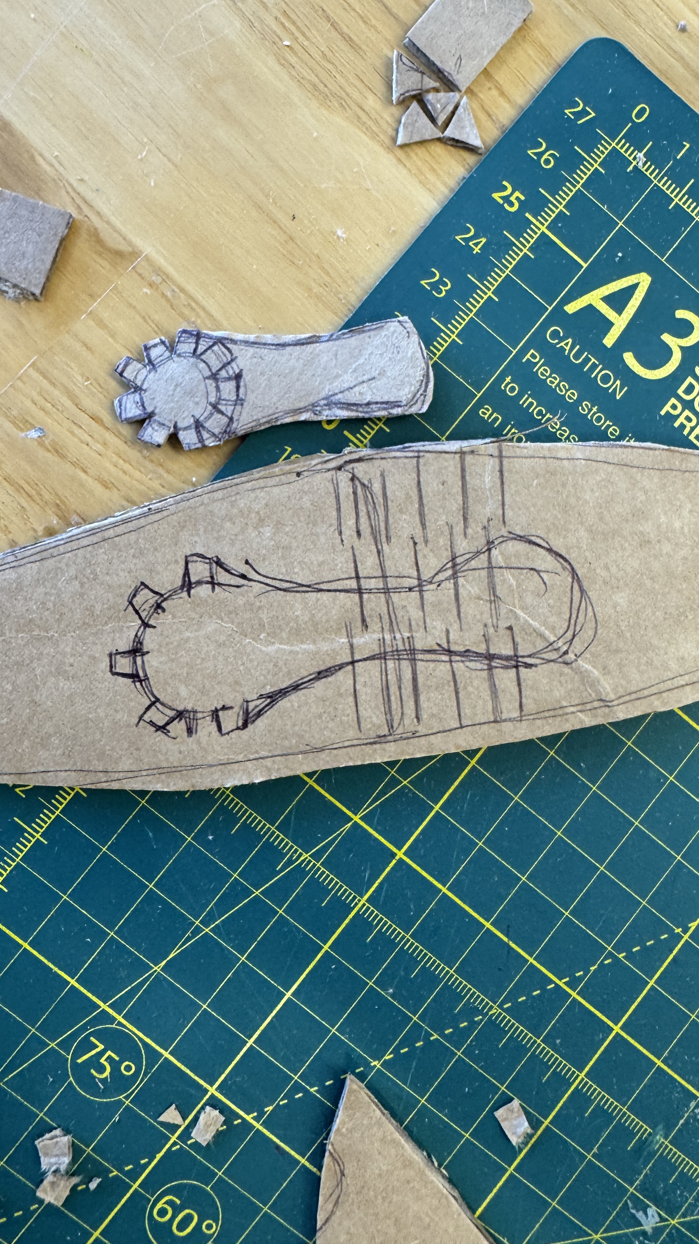 Next, I worked on the second tool: a line drawer with an adjustable gap between the teeth. This would make it easier to draw lines when constructing a box. I created another cardboard prototype.