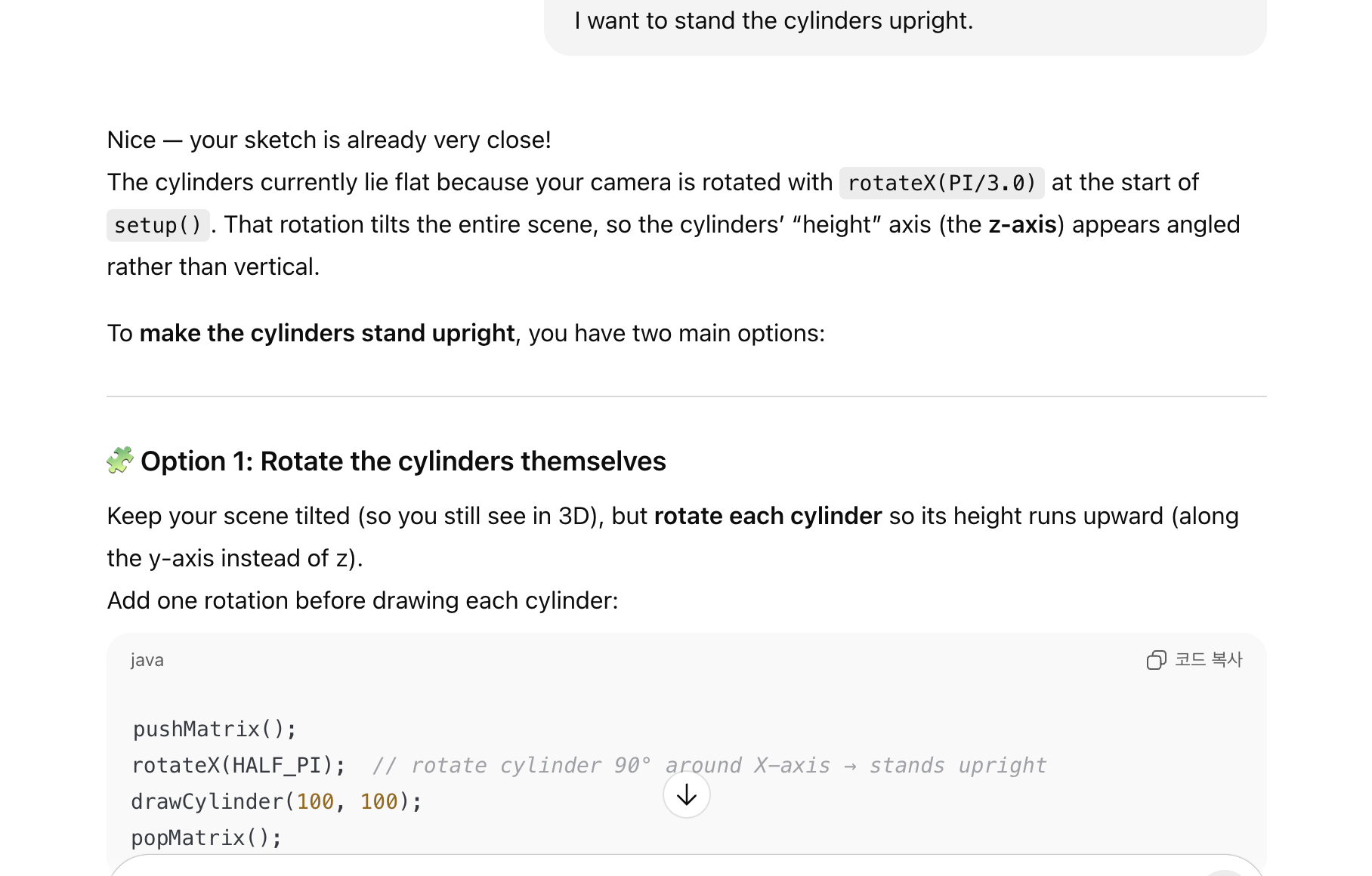 While working on the example, I struggled to make them stand upright. Eventually, I decided to ask ChatGPT for a hint to solve the problem.